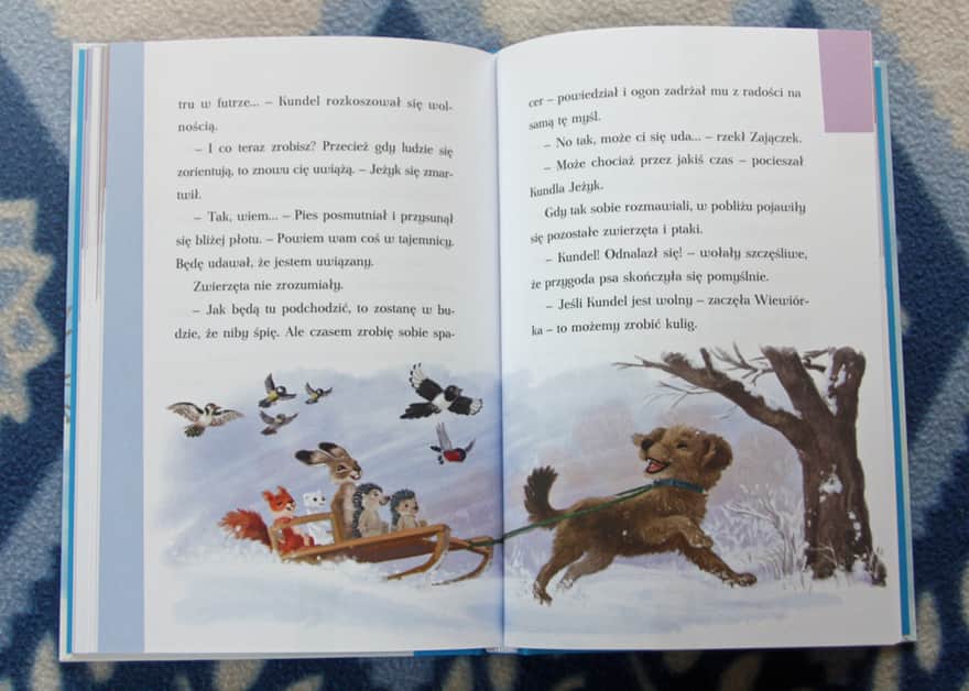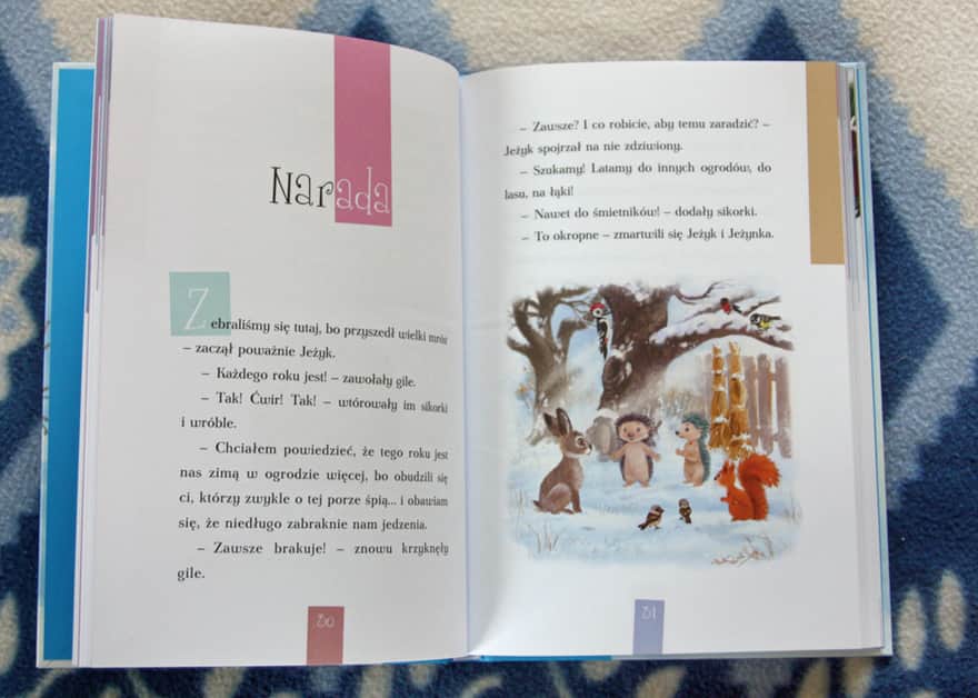 Mimo, że zimowa, to jednak bardzo ciepła opowieść o mieszkańcach ogrodu: Jeżyku i jego koleżance Jeżynce, Wiewiórce, Zajączku, Kundlu i ptakach.