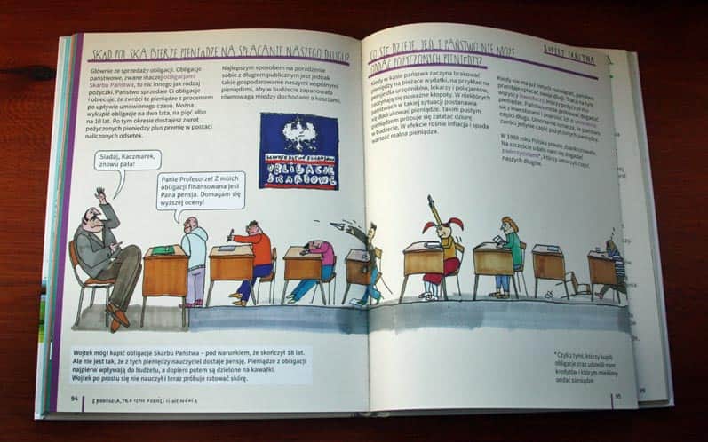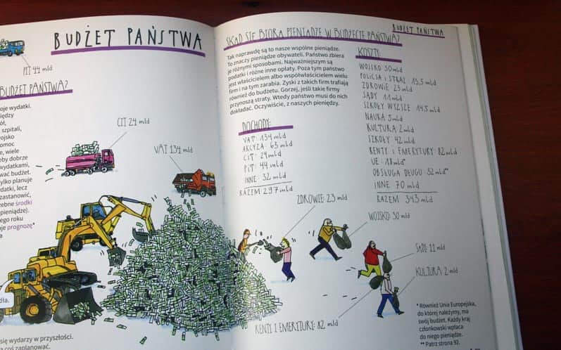 3. Warstwa ilustracyjna: doskonale obrazuje poruszane zagadnienia, jednak nie brak w niej dosadności, a nawet brutalności. Młodszym nastolatkom na pewno przypadnie do gustu! Uwierzcie na słowo: kiedy zobaczycie ilustracje dotyczące „cięcia stóp finansowych” czy „strumienia dochodów” terminy te na długo wryją się wam w pamięć!