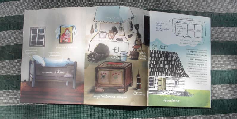 O łatwą i niesamowicie przyjemną edukację dzieci (i przy okazji nas – rodziców!) zadbało …. I trzeba przyznać, że autorki zrobiły to w przepięknym stylu! Stron niby niewiele, z informacji wybrane to co najistotniejsze, jednak jak to często bywa liczy się jakość, a nie ilość. Na rozkładówkach zajrzymy do łemkowskiego domu, czyli do chyży, a także do cerkwi, poznamy części stroju ludowego, plan łemkowskiej wioski, łemkowskich sąsiadów: Romów i Żydów, tradycyjne zajęcia Łemków i sylwetki łemkowskich artystów.