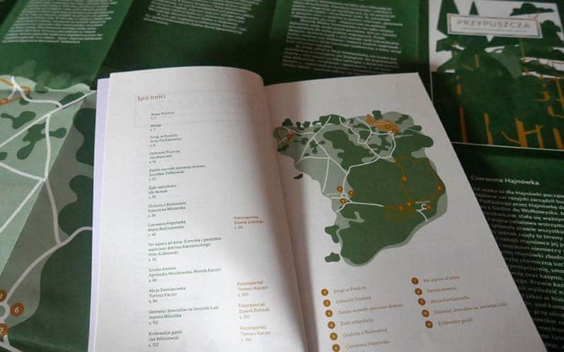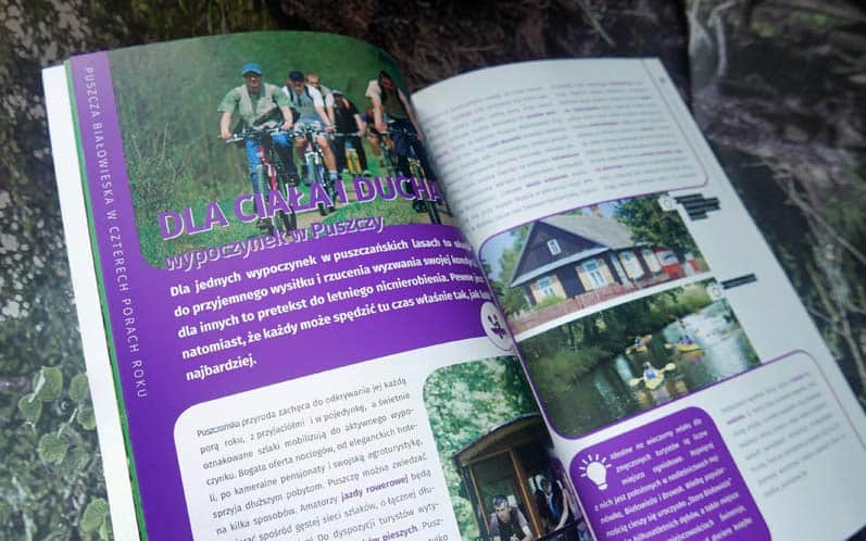 Jak w każdej publikacji o Puszczy znajdziemy tu piękne zdjęcia przyrody, ale co wcale nie takie częste w tego typu folderach bardzo dużo naprawdę praktycznych informacji: o tym, na co warto zwrócić uwagę odwiedzając Puszczę wiosną, zimą, latem i jesienią, propozycje tras spacerów, szlaków rowerowych, miejsc, które warto odwiedzić oraz informacje o cyklicznych imprezach w regionie.