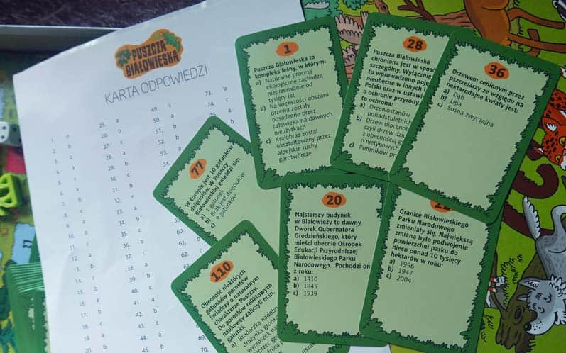 O ile sama mechanika gry łatwa, pytania bywają trudne trudne: z historii Puszczy i parku narodowego, gatunków grzybów, porostów, rzadkich ptaków i bezkręgowców. Karty sprawdza m.in. czy znacie np. rok utworzenia Lasów Państwowych i rok wybudowania Dworku Gubernatora? Czy wiecie, czy symbolem siły i wytrwałości jest dąb, osika czy grab, albo co oznacza, że drzewo jest pomnikiem przyrody, jak długo rosną rogi u żubrów, jaki kolor mają kwiaty czosnku niedźwiedziego, jaka jest powierzchnia Białowieskiego Parku Narodowego w hektarach…?