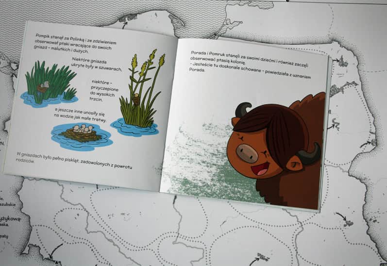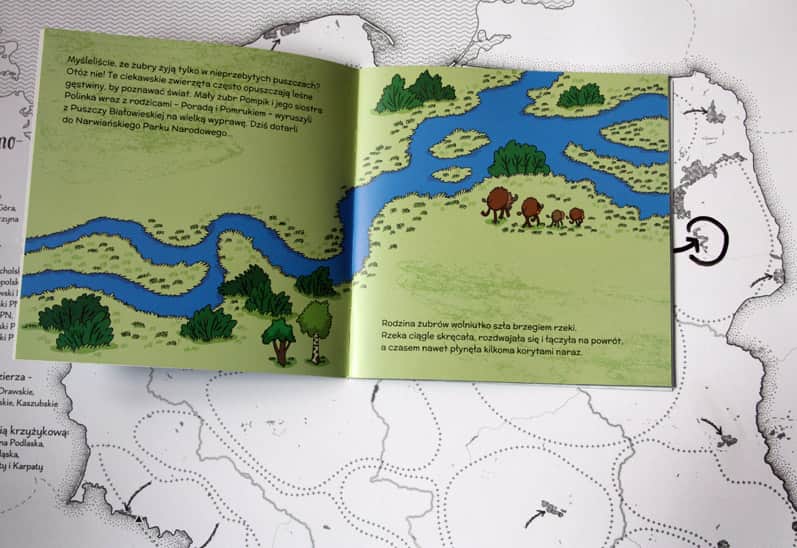 Czy poznaliście może na takim tle sportretowaliśmy WYPRAWY ŻUBRA POMPIKA? Tak, to wydana pod naszym patronatem MAPA POLSKI DLA DZIECI, a dokładniej jedna z jej kart edukacyjnych. Możecie na niej sami rozpoznać, zaznaczyć i podpisać Narwiański Park Narodowy. Jesteście gotowi na takie wyzwanie?