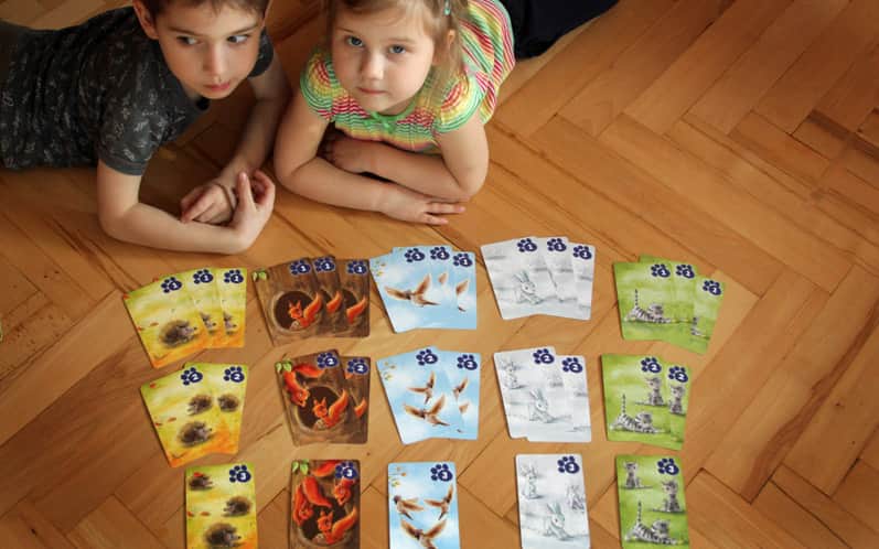 Karty możemy rozkładać stopniowo (jak sugeruje instrukcja), lub wszystkie jednocześnie (tak zdecydowały nasze dzieciaki), tyle, że wtedy raczej musimy przenieść się z grą na podłogę.