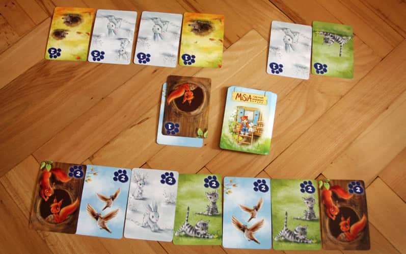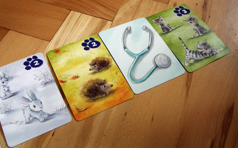 Gracze otrzymują żeton z kliniką: to ich lecznica, do której zaraz ustawi się kolejka chorych zwierzątek! Karty ze zwierzętami rozkładamy tyłem i kolejno losujemy “pacjentów”. Każdy kolejny w kolejce musi pasować do poprzedniego: albo gatunkiem (np. jeden kot do dwóch kotów), albo liczbą zwierząt (np. dwa jeże do dwóch wiewiórek).