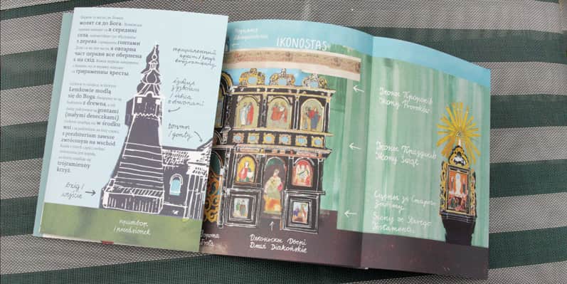 O łatwą i niesamowicie przyjemną edukację dzieci (i przy okazji nas – rodziców!) zadbało …. I trzeba przyznać, że autorki zrobiły to w przepięknym stylu! Stron niby niewiele, z informacji wybrane to co najistotniejsze, jednak jak to często bywa liczy się jakość, a nie ilość. Na rozkładówkach zajrzymy do łemkowskiego domu, czyli do chyży, a także do cerkwi, poznamy części stroju ludowego, plan łemkowskiej wioski, łemkowskich sąsiadów: Romów i Żydów, tradycyjne zajęcia Łemków i sylwetki łemkowskich artystów.