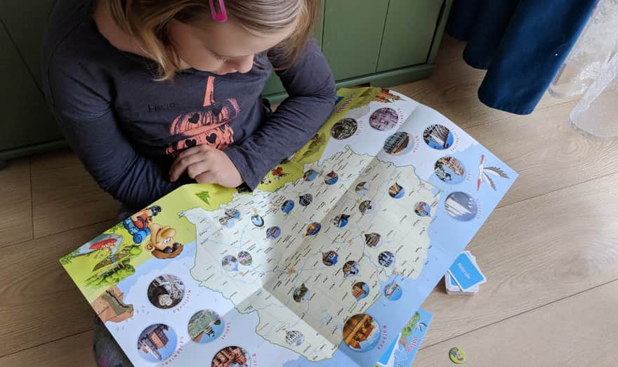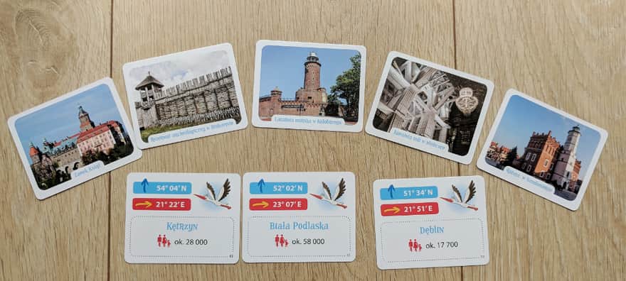 Na odwrocie każdej z kart znajdziemy współrzędne geograficzne (a poza tym dane o ludności na kartach z nazwą miejscowości, lub opis zabytku na kartach z fotografią atrakcji turystycznej). To dobry moment, aby wytłumaczyć młodszym graczom co owe liczby oznaczają, jak i po co ich używamy! Dodatkowo mamy też do dyspozycji mapę, na której możemy odnaleźć wszystkie miejscowości i atrakcje z kart.
