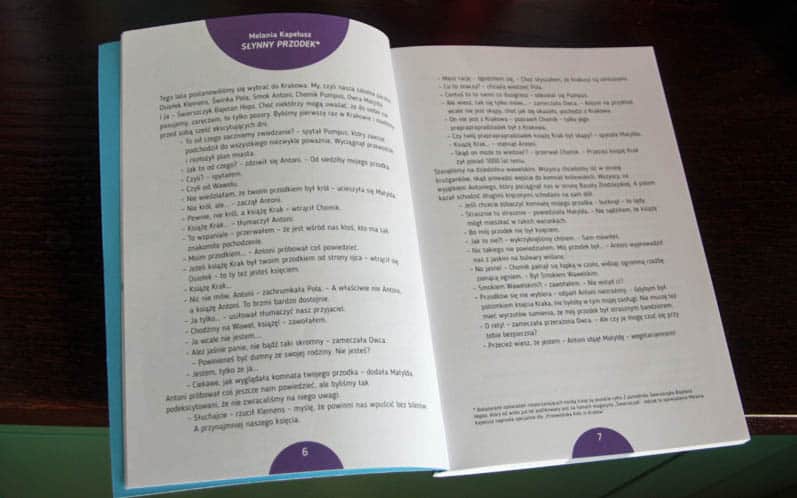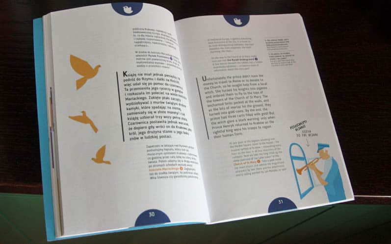 Każdy rozdział to jednak przede wszystkim propozycja spaceru. Na początek otrzymujemy czytelną, kolorowa mapkę z ponumerowanymi najciekawszymi punktami trasy. W opisie znajdziemy zarówno ciekawostki, informacje praktyczne (np. godziny otwarcia), jak i zadania do wykonania (np. sprawdzenie ile czasu zajmuje obiegnięcie Barbakanu). Treść przeplatana jest legendami i zabawnymi, kolorowymi ilustracjami. Na końcu każdego z rozdziałów dzieci znajdą też kilka graficznych zagadek (kolorowanki, labirynty, zagadki).