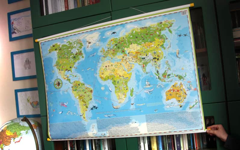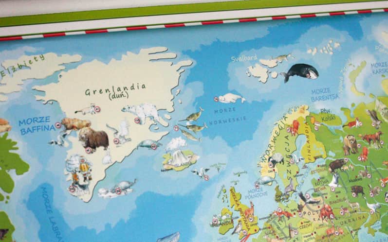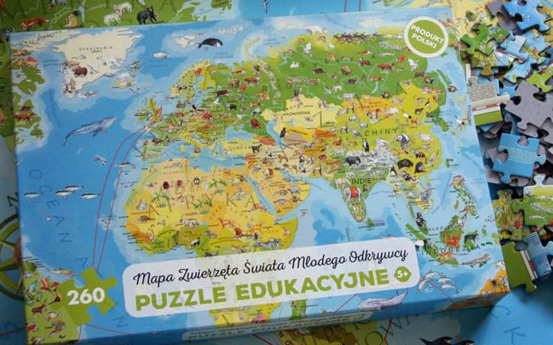 Przy układaniu puzzli na pewno przyda się Mapa Zwierzęta Świata Młodego Odkrywcy – oczywiście wg tego samego wzoru. Wydawca przygotował ją w różnych wersjach: laminowana lub nie, oprawiona lub nie – do wyboru do koloru! Nasza to wersja MIDI laminowana, oprawiona w rurki PCV w rozmiarze 100 x 70 cm.