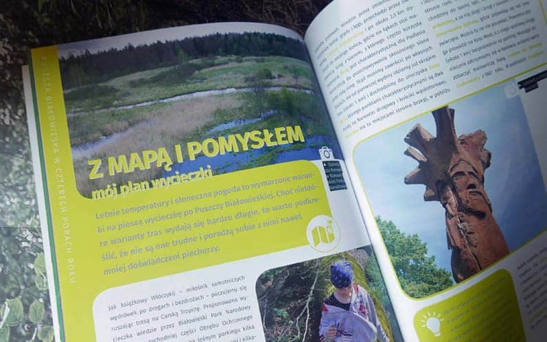 Jak w każdej publikacji o Puszczy znajdziemy tu piękne zdjęcia przyrody, ale co wcale nie takie częste w tego typu folderach bardzo dużo naprawdę praktycznych informacji: o tym, na co warto zwrócić uwagę odwiedzając Puszczę wiosną, zimą, latem i jesienią, propozycje tras spacerów, szlaków rowerowych, miejsc, które warto odwiedzić oraz informacje o cyklicznych imprezach w regionie.
