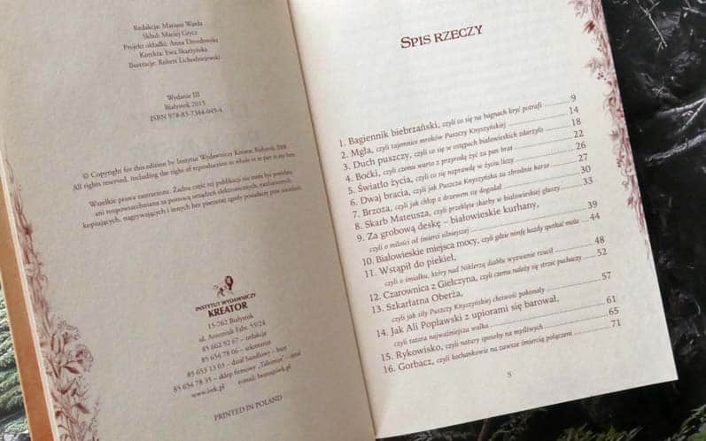 Poznamy tu m.in. kilka legend o czarownicy Ksantypie, fakty i mity o uroczysku Zamczysko, „miejscach mocy”, czy naznaczonych dzikach. Książka jest pisana dla dorosłego czytelnika, jednak treść wielu rozdziałów możemy też opowiedzieć dzieciakom np. podczas puszczańskich wędrówek.