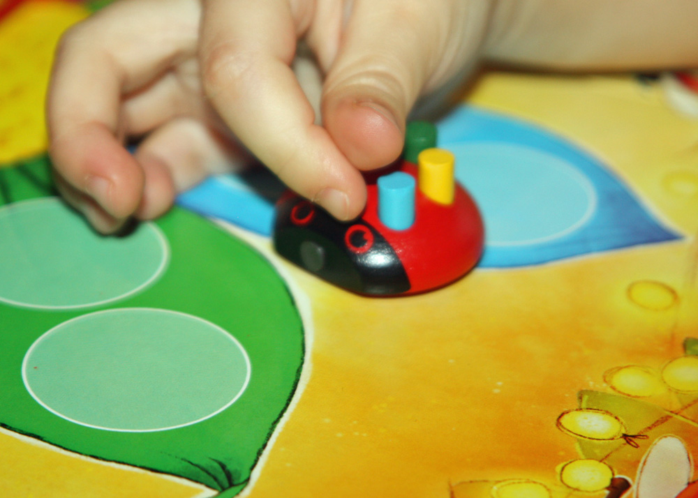 Kolorowe kropki - małe, drewniane walce są świetnym sposobem na rozwijanie małej motoryki dziecięcych rączek. Jest to duża zaleta w przypadku starszaków (3+) lecz wada, gdy przy stole chcemy posadzić dwulatka o mniej sprawnych paluszkach (gra jest bowiem tak sympatyczna, a zasady tak proste, że nasza dwulatka dzielnie towarzyszyła starszym braciom w rozgrywce). Jednak przy wymianie kropek potrzebna jej była pomoc. W przypadku tak małych dzieci z kropkami może się wiązać jeszcze jeden problem - mogą zacząć wyglądać wyjątkowo apetycznie :)