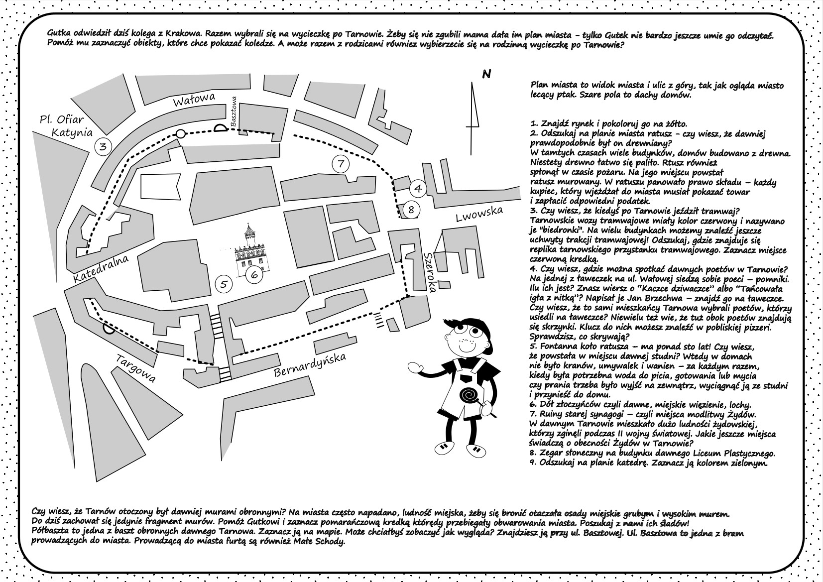In the past, cities were often attacked, so to protect themselves from invaders, cities were built on hills and surrounded by defensive walls. Tarnów is also a city founded on a hill. Defensive walls ran along the edge of the hill, below which there was a rampart, and then a water-filled moat. Do you know why the street that runs along the path of the old city walls is called Wałowa? Look at the map of Tarnów and try to mark the route of the former fortifications.