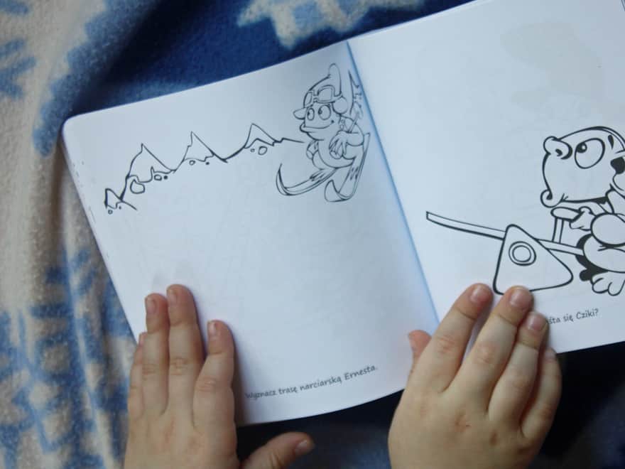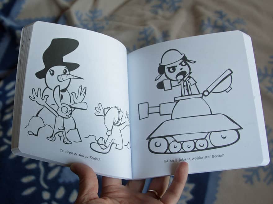 Czasami wystarczy jedna lub kilka kresek, żeby uzupełnić rysunek, czasami zadanie wymaga bardziej twórczego podejścia do tematu. Bohaterzy książeczki kochają niebanalne pomysły – bo kto powiedział, że na wędkę da się złowić tylko rybę, a ze śniegu ulepić tylko bałwana, a bańki mydlane muszą być okrągłe?