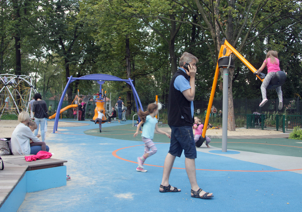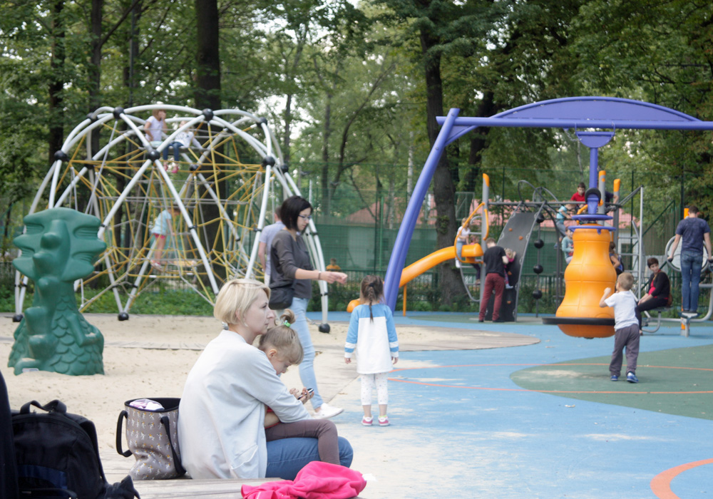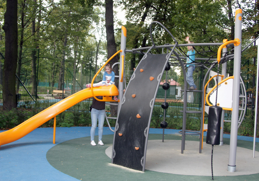 Nowoczesny plac zabaw z nietypowymi atrakcjami, jednak raczej dla starszych dzieci - tj. ciekawe konstrukcje do wspinania, huśtania i akrobacji.