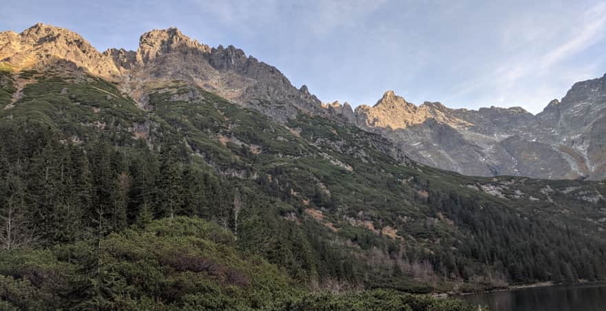 Stojąc przed schroniskiem rozpościera się przed nami piękna panorama Tatr. Widzimy stąd Rysy - najwyższy szczyt Polski, wszak Tatry to najwyższe polskie góry! Rysy mają kilka wierzchołków, a zbocze góry wygląda jakby je ktoś porysował - właśnie od tych głębokich rys - górskich żlebów wzięła się ich nazwa.