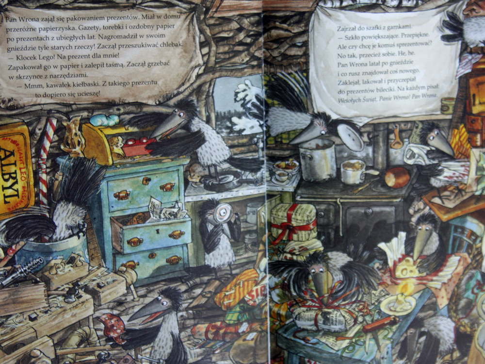 Pan Wrona zaszyty w ciemnym gnieździe, opatulony ciepłym kocem nawet zapomniał, że zbliża się Wigilia. Dla Pana Wrony najistotniejsze jest otrzymywanie prezentów, jednak nie liczy na życzliwość przyjaciół – przygotowuje prezenty sam dla siebie, sam je pakuje, sam rozpakowuje… i stwierdza, że w takim razie już po świętach…