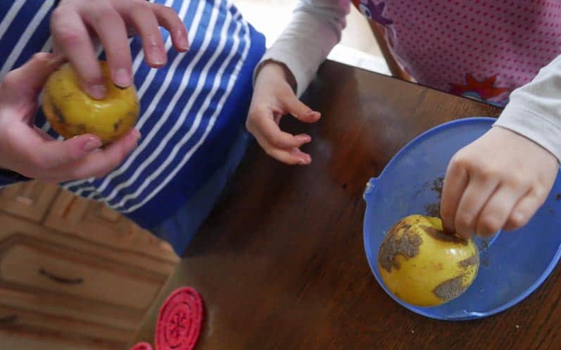 Najpierw dokładnie smarujemy jabłko masłem, po czym obtaczamy je w pieprzu:
