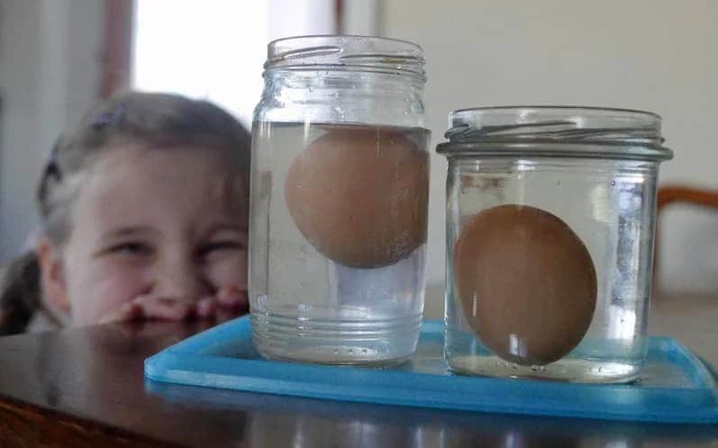 Przebieg eksperymentu:: do obu szklanek nalewamy wodę, a w jednej z nich rozpuszczamy 2-3 łyżki soli. Do obu kolejno wkładamy świeże, surowe jajko. To samo jajko w jednej szklance tonie, w drugiej unosi się w wodzie! Dlaczego? Przedmioty pływają w wodzie wtedy, kiedy mają mniejszą od niej gęstość. Surowe jajko ma większą gęstość od wody, dlatego tonie. Kiedy dodamy do wody sól zwiększamy jej gęstość. Słona woda ma większą gęstość niż jajko, więc jajko pływa!