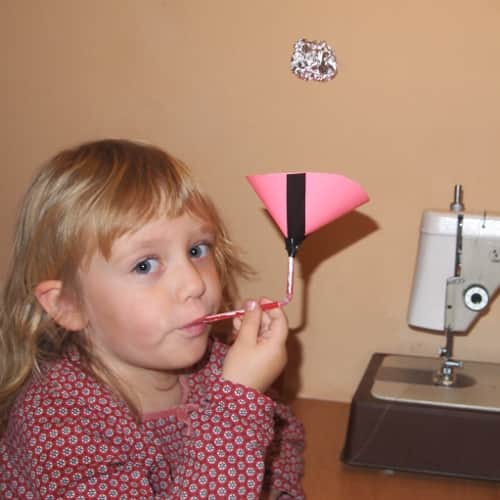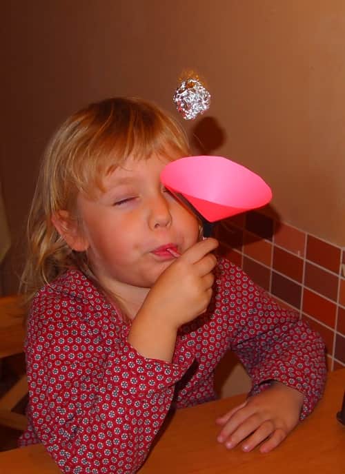 Jeśli dmuchniemy szybko i mocno kulka wyskoczy z lejka, jeśli będziemy dmuchać długo i równomiernie może uda nam się utrzymać dłużej kulkę w powietrzu nad lejkiem! Taka zabawa to świetny trening zwiększający pojemność płuc!