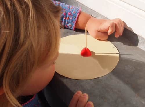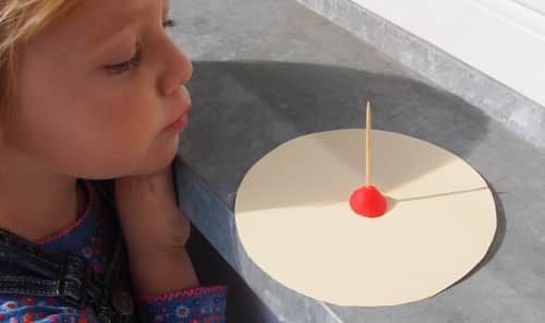 Z kartki, plasteliny i wykałaczki zróbmy sobie zegar słoneczny - z kartki wycinamy okrągłą tarczę, na środku przyklejamy kawałek plasteliny, w który wbijamy patyczek lub wykałaczkę. W słoneczny dzień postawmy nasz zegar na balkonie lub parapecie (uwaga na wiatr!). Wspólnie z maluchem zaznaczajmy, jak zmienia się w ciągu dnia położenie słońca na niebie.