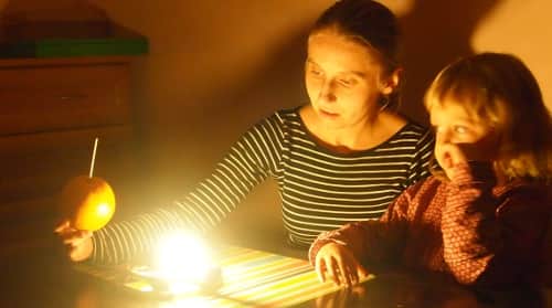 Gdy już będzie ciemno zgaście światło i zapalcie lampkę (najlepiej zdjąć z niej klosz i odsłonić samą żarówkę). Teraz weźmy małą piłkę lub okrągły owoc. Lampka to będzie nasze Słońce, owoc - Ziemia.