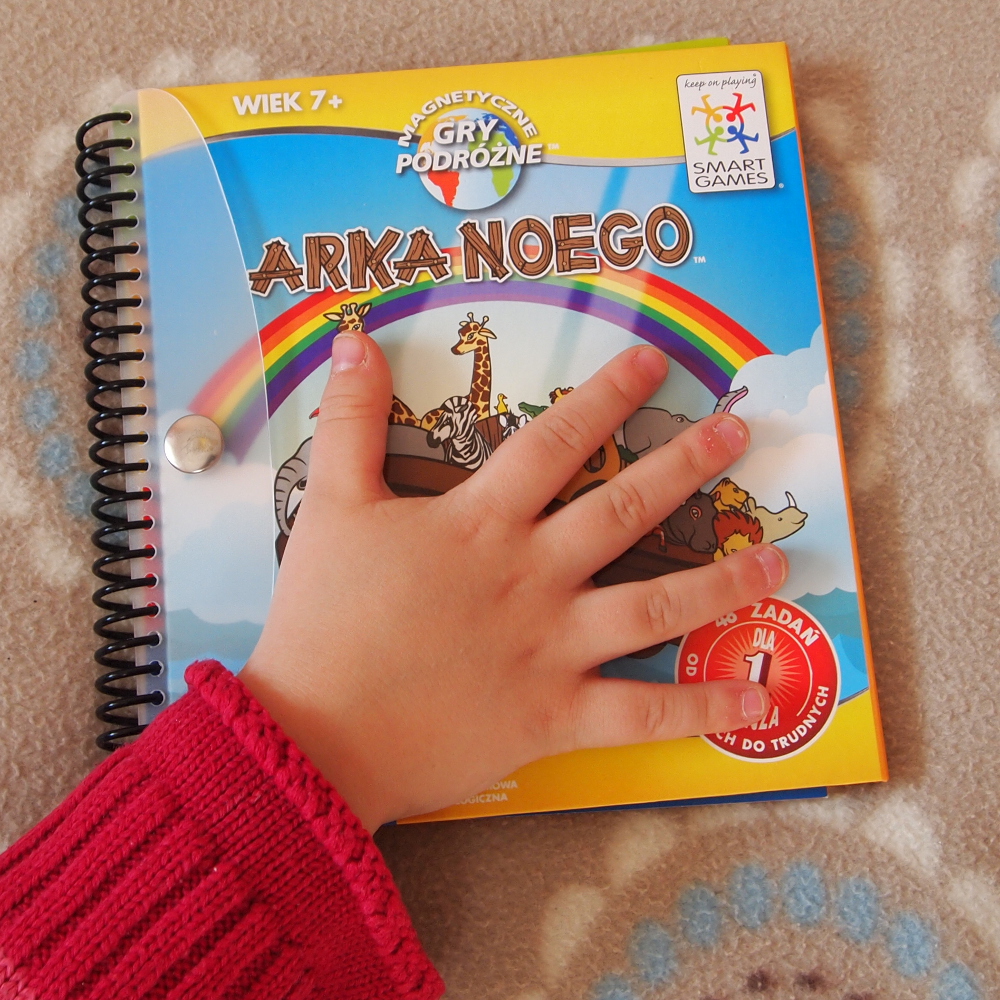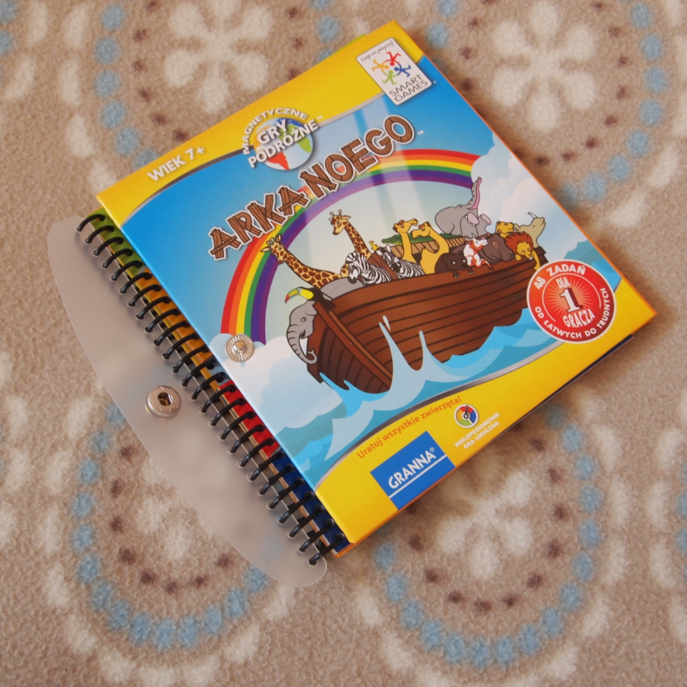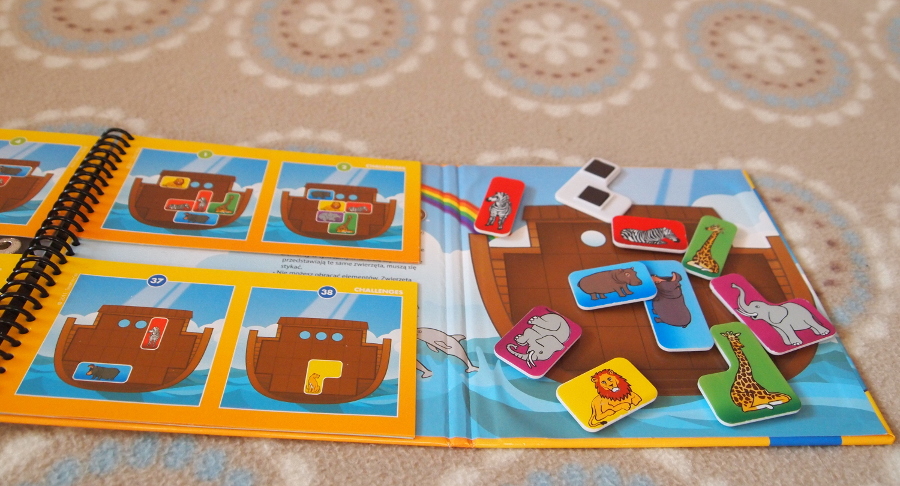 Magnetyczna gra podróżna "Arka Noego" to układanka logiczna. Po lewej stronie jest książeczka z zadaniami o 4 różnych stopniach trudności (najłatwiejsze rozwiązała sama 4 latka, z najtrudniejszymi problem ma nawet dorosły).