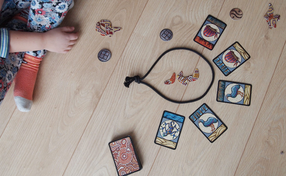 Elementy gry: w pudełku otrzymujemy talię kart z rysunkami zwierząt, komplet żetonów 5-ciu terenów łowieckich dla każdego z graczy, oraz po 12 bumerangów dla każdego z graczy.