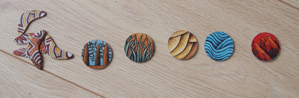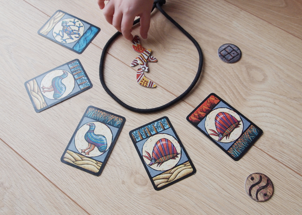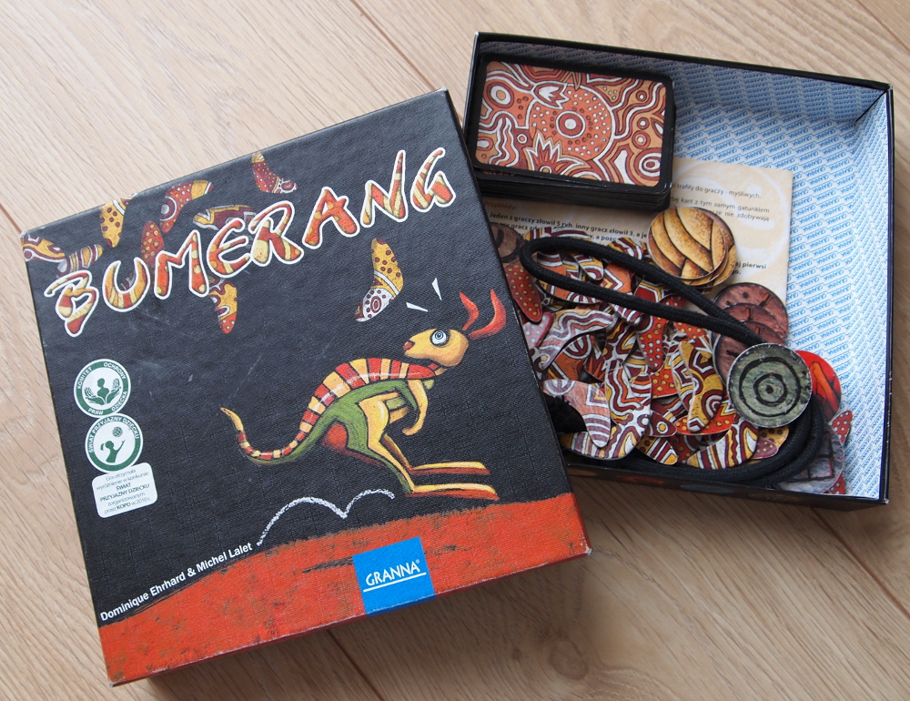 Elementy gry: w pudełku otrzymujemy talię kart z rysunkami zwierząt, komplet żetonów 5-ciu terenów łowieckich dla każdego z graczy, oraz po 12 bumerangów dla każdego z graczy.
