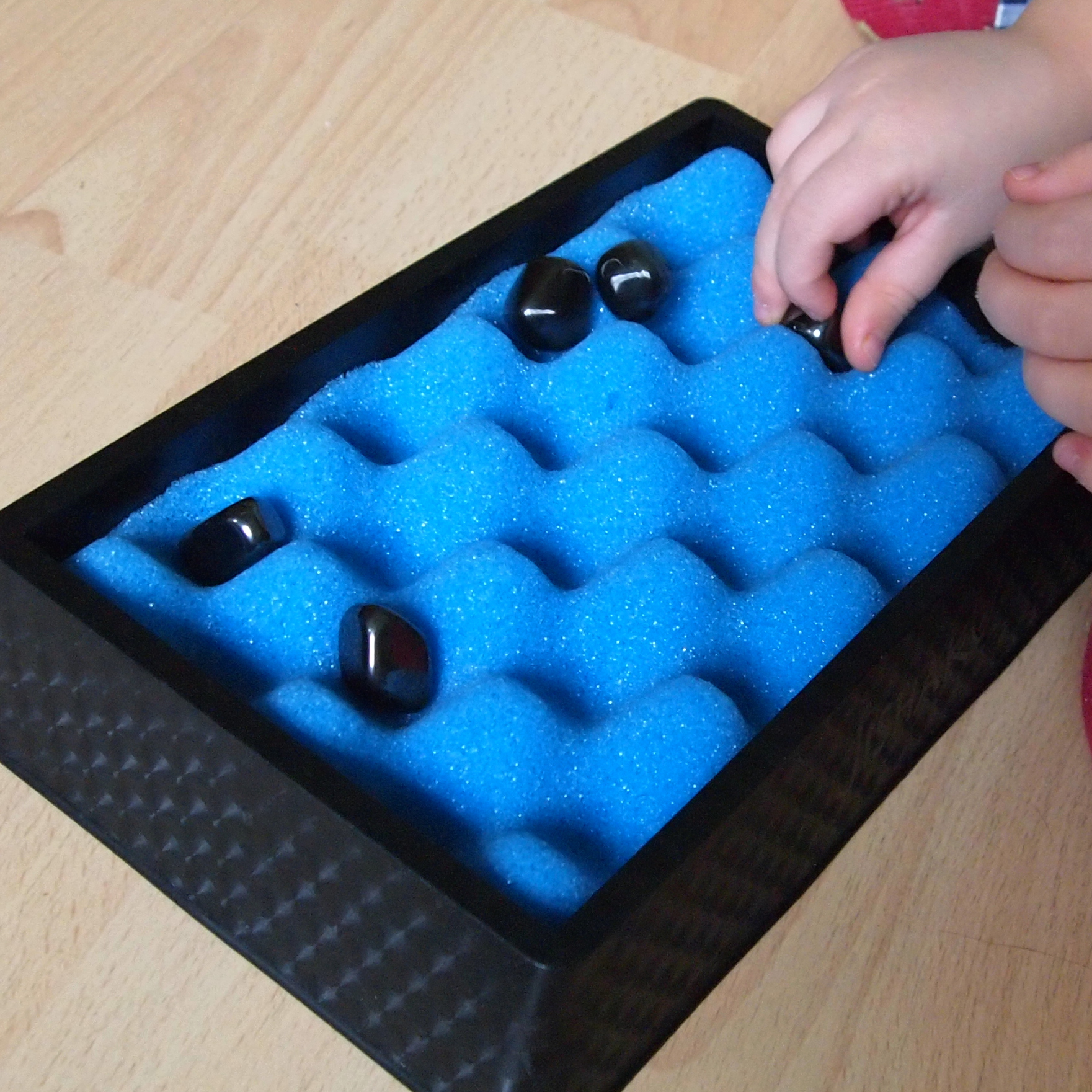 Elementy gry: plastikowy pojemnik z gąbką tworzący planszę dla magnesów oraz 18 magnesów.