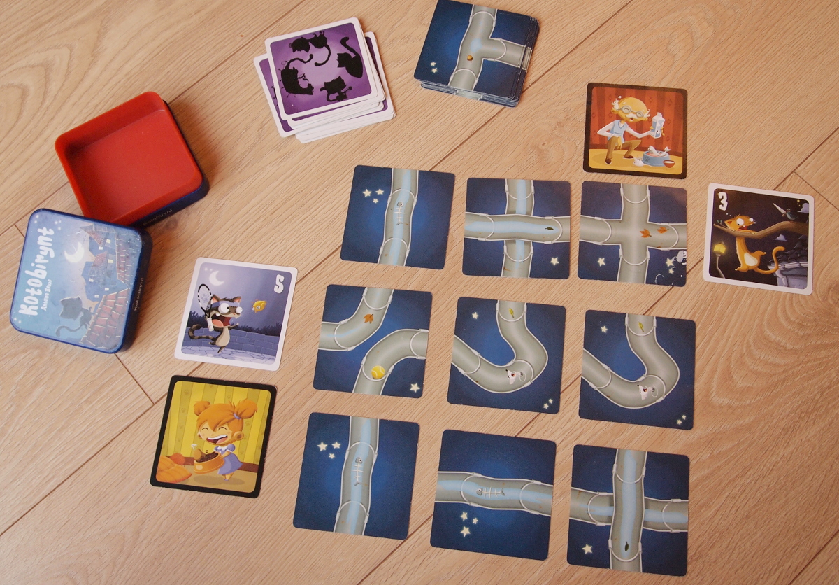 Z kart tuneli ustawiamy kwadrat 3x3 karty (łatwy - najlepszy na początek lub dla młodszych, przedszkolnych graczy) lub trudniejszy 4x4 karty. Według instrukcji ustawiamy dwie karty właścicieli oraz pierwsze dwa kociaki (karty kotów mają różną ilość punktów - niektóre bardziej opłaca się łapać inne nie). Mamy dwa ruchy - możemy obrócić dowolną kartę tunelu lub w odpowiedni sposób ją zamienić na inną tak, by utworzyć połączenie pomiędzy kotem, a opiekunem. Jeśli nam się to uda kociak jest nasz!