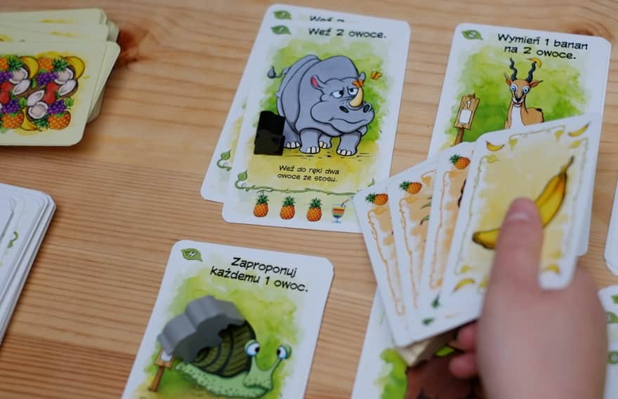 Przykładowo Agata ma 3 ananasy i banana może więc stanąć na karcie z nosorożcem i zamiast wykonywać akcję napisaną na karcie (wziąć do ręki kolejne dwa owoce), robi sok. Może też stanąć na dowolnej innej karcie i zebrać jeszcze więcej owoców (ponosi wtedy ryzyko, że ktoś może jej zdobyte wcześniej owoce podebrać). To od niej zależy, którą kartę i którą opcję wybierze. Wchodząc na kartę, na której już ktoś stoi musi mu zapłacić dając mu jeden owoc.