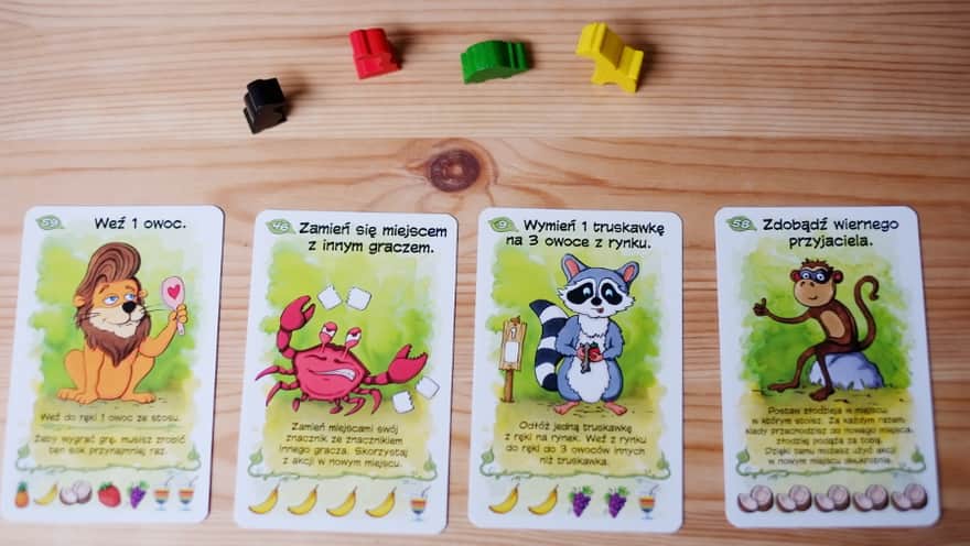 Sami decydujemy, na którym polu staniemy. Stając na danej karcie możemy albo wykonać znajdującą się na niej akcję, czyli to, co jest na niej napisane (np. w jakiś sposób dostać owoce) lub jeśli zebraliśmy już odpowiednią ilość owoców stając na odpowiednią kartę możemy wykonać wskazany na niej sok.