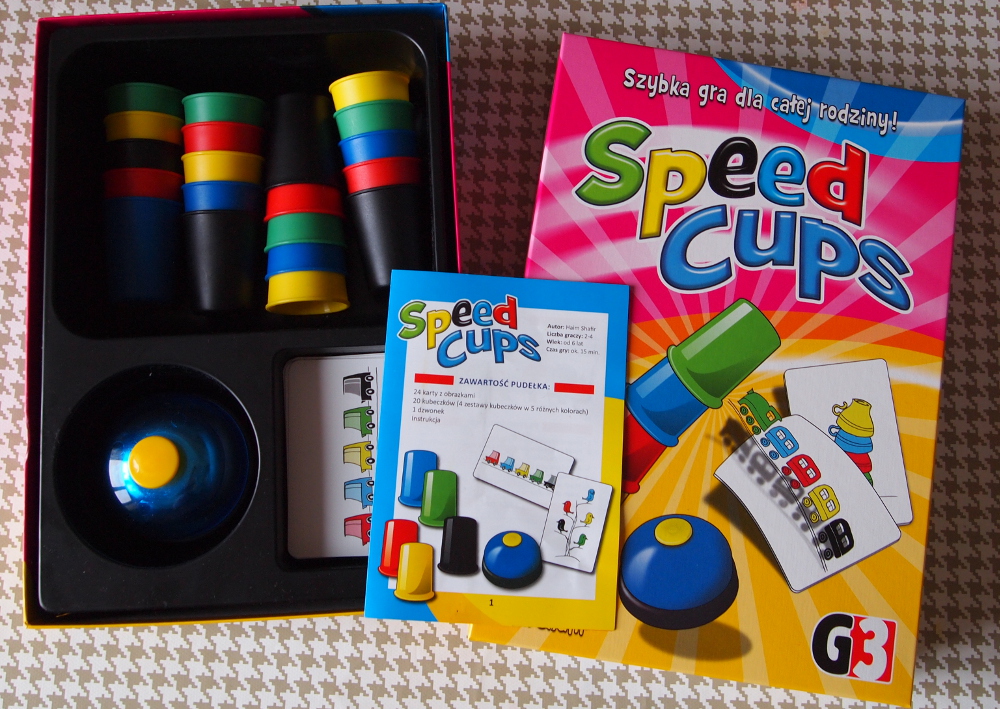 W pudełku: Instrukcja, dzwonek, 5 kompletów 6-ciu plastikowych kubeczków w różnych kolorach, karty
