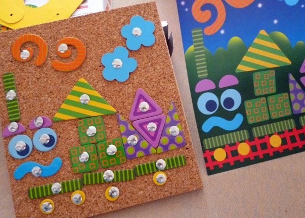 - korkową planszę - Plansza jest gruba, nie ma możliwości, że dziecko przebije ją pinezką na wylot i się pokaleczy. Dobrym pomysłem byłoby dołączenie do zestawu dodatkowej planszy korkowej, ponieważ dziecko nie zawsze chce burzyć swoje dzieło.