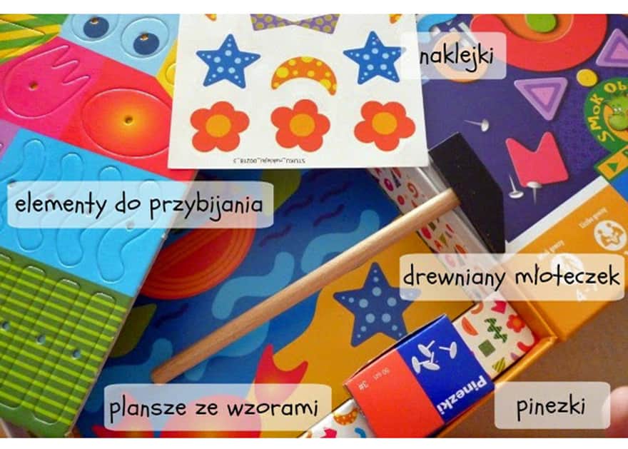 - 46 elementów do przybijania - Elementy wykonane są z grubego kartonu, są bardzo kolorowe i dwustronne.