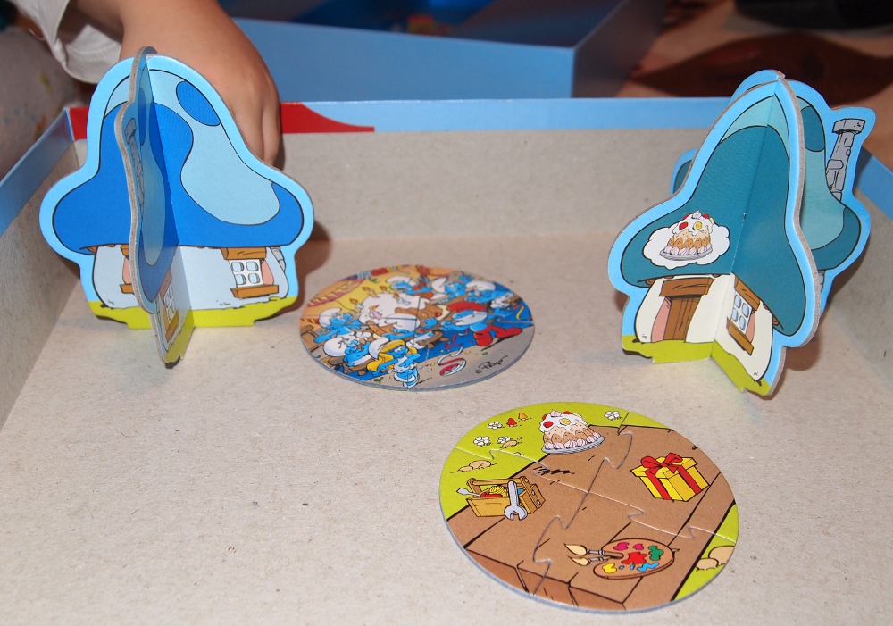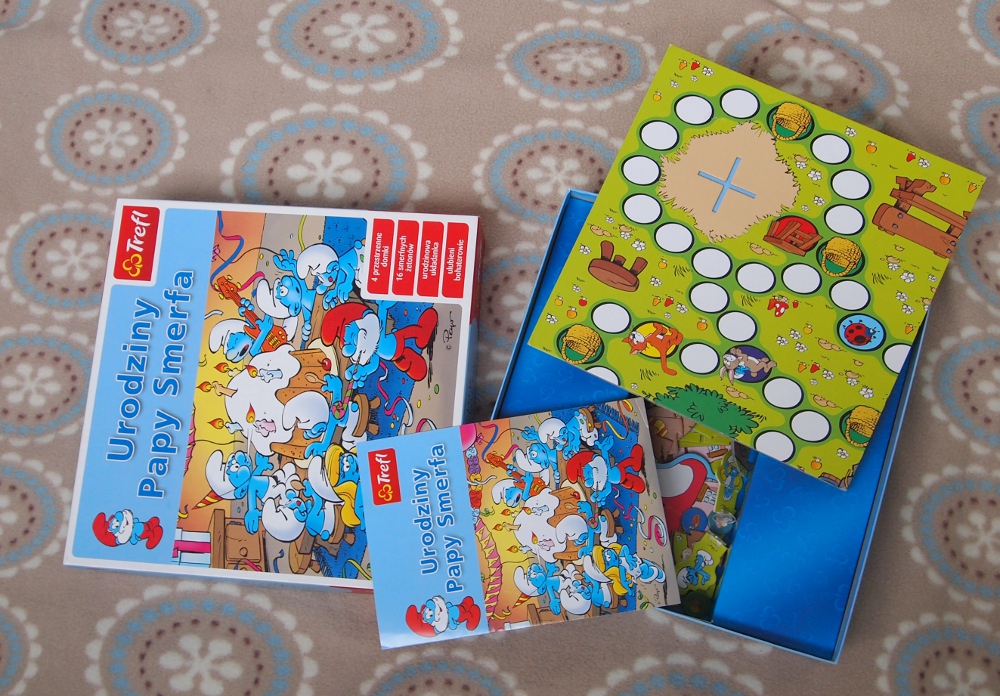 Wykonanie: Gra solidnie wykonana – duża, gruba tekturowa plansza z domkami z grubego kartonu przedstawiająca wioskę Smerfów - nasza córka była zachwycona, żetony i puzzle z grubego kartonu. Zastrzeżenie mamy jedynie do pionków wykonanych z dość cienkiej tekturki przez co np. pionek córki czterolatki – smerfetka – dość szybko został przełamany i trzeba było go usztywnić.