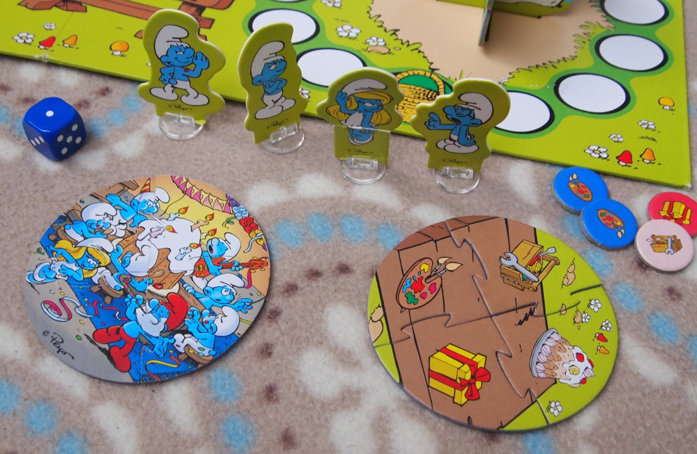 W każdym domku znajduje się część prezentu – np. w jednym domku jest ciasto, w drugim farbki, w trzecim narzędzia a w czwartym prezent. Chodząc po planszy gracz szuka i zbiera żetony (z farbkami, ciastem, prezentem i narzędziami). Znalezione żetony zanosi do określonego domku (np. żeton z farbkami do domku z farbkami), w którym za żeton dostaje element układanki. Wygrywa Smerf, który jako pierwszy zbierze 4 różne żetony i po zaniesieniu ich do 4 różnych domków ułoży kompletną układankę.
