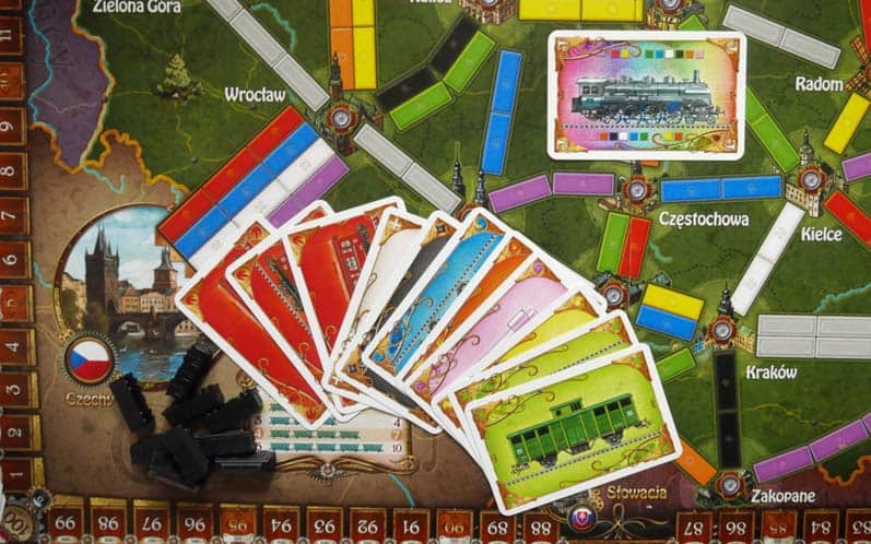 Aby ułożyć swój pociąg między dwoma miastami musimy „zapłacić” kartami wagonów w odpowiednim kolorze i odpowiedniej ilości (tęczowa lokomotywa pełni funkcję jokera).