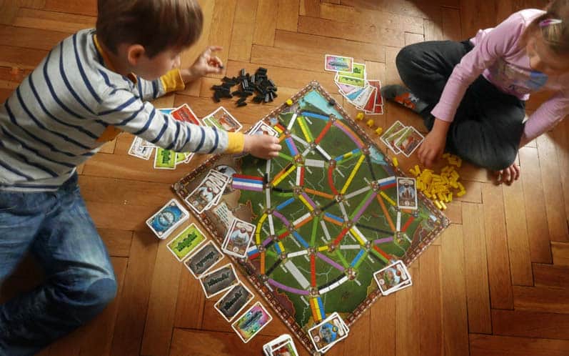 Nasz sprawdzony sposób na ułatwienie rozgrywki z młodszymi dziećmi to gra w otwarte karty. Bilety z trasami pozostawiamy odkryte i dzięki temu gra nabiera charakteru kooperacyjnego: widząc wzajemnie swoje cele możemy sobie pomagać (szczególnie starsi młodszym) np. podpowiadając dobry ruch, nie przeszkadzając w realizacji biletów.