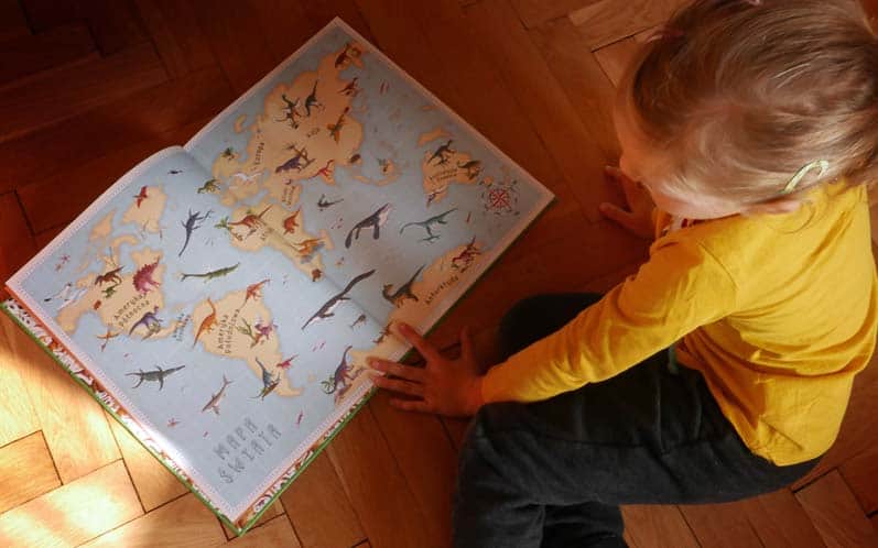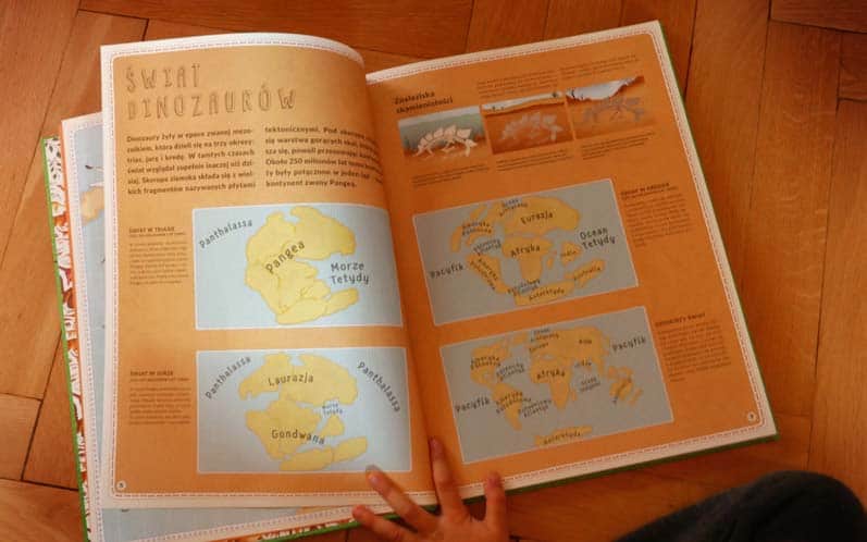 Książkową podróż w czasie i przestrzeni rozpoczynamy od mapy świata, a jednak warto też pokazać dzieciom, że miliony lat temu kontynenty wyglądały całkiem inaczej – zobaczymy je w krótkim wstępie. Tu też dowiemy się w skrócie jak powstają skamieniałości.
