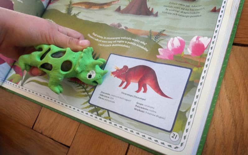 Dodatkowa atrakcja to ukryte przedmioty niepasujące do dawnego świata – np. lornetka, siatka na motyle czy śliniak na szyi dinozaura. Ich odnalezienie to wielka radość dla małego odkrywcy!