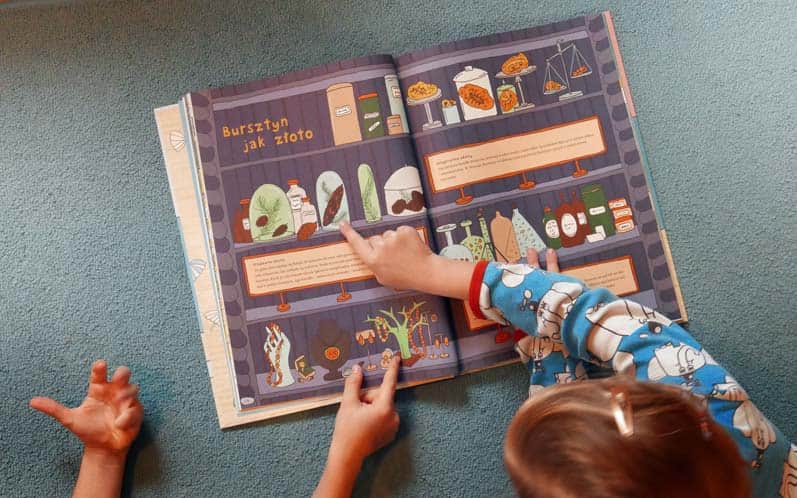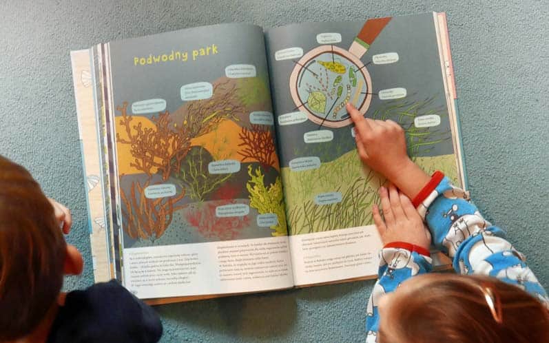 Od obrazu szybko i sprawnie przejdziemy do tekstu: tak sprawnie wplecionego w ilustracje, że właściwie czyta się sam… Ramki z krótkimi, kilkuzdaniowymi informacjami na pewno nie zdążą wymagającego młodego czytelnika zanudzić, a za to przekażą wartościową garść faktów i ciekawostek. Wszak autorka to twórczyni nagradzanego portalu edukacyjnego balticarium.com (zajrzyjcie koniecznie!).