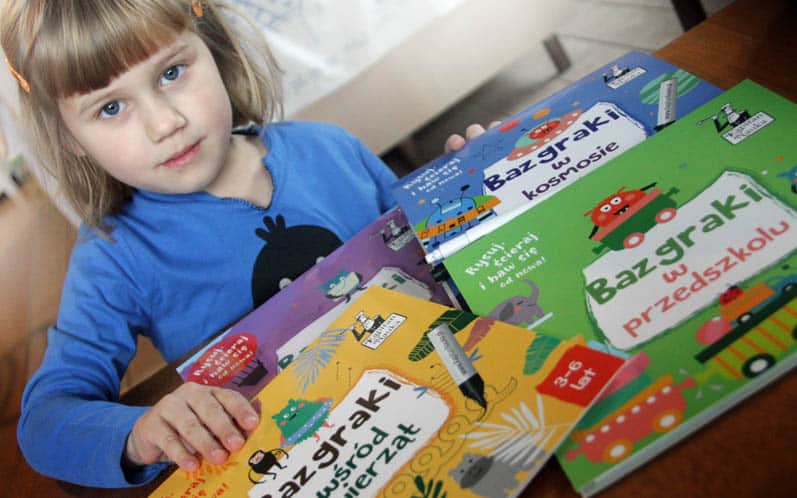 Ciekawy format: sztywne dwustronne karty połączone spiralą pozwala korzystać z Bazgraków w różnych warunkach: także w podróży, w parku, w poczekalni itp., a aż 4 tytuły do wyboru pozwolą lepiej dopasować temat zagadek do zainteresowań małego artysty.