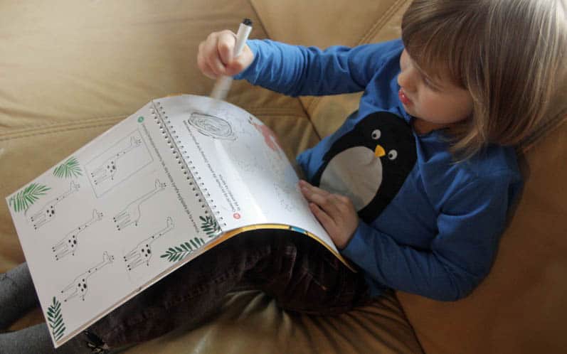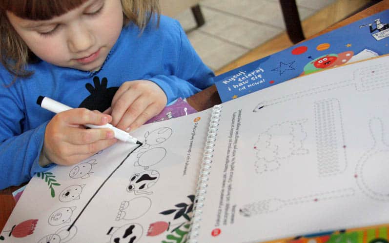W każdej z 4 wchodzących w skład serii książeczek znajdziemy aż 24 zagadki do wielokrotnego rozwiązywania, wypełniania i… bazgrania załączonym pisakiem. Jeśli coś nie wyjdzie – łatwo pozbędziemy się błędu za pomocą ściereczki czy np. chusteczki higienicznej.