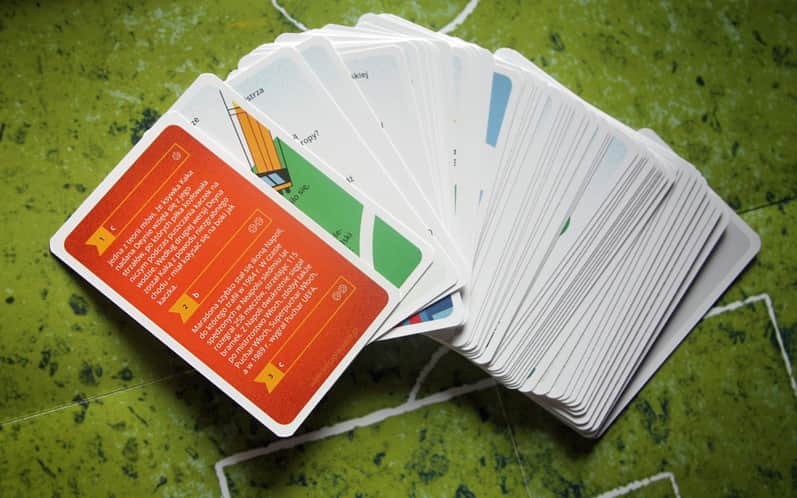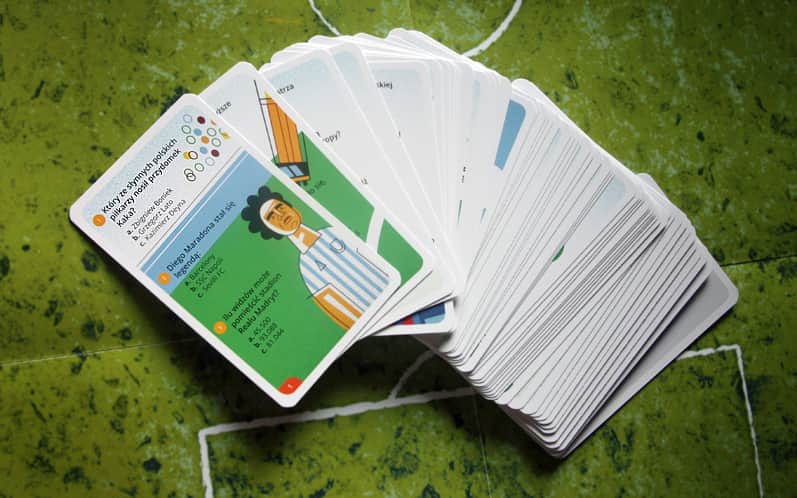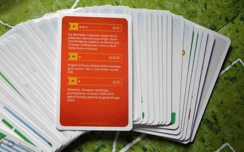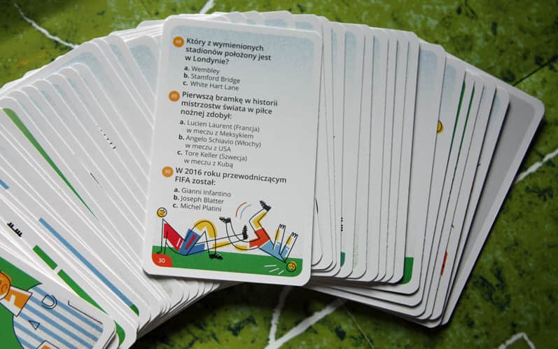 W środku, podobnie jak w innych kieszonkowcach, znajdziemy quiz karciany. Każda karta to 3 pytania i 3 możliwe odpowiedzi: łącznie 162 piłkarskie fakty i ciekawostki. Na odwrocie znajdziemy rozwiązanie. Nie będzie to tylko sucha odpowiedź „1a, 2b, 3c”, ale również krótkie wyjaśnienie, uzupełnienie informacji z pytania. Na tylnej stronie mamy też oznaczoną skalę trudności pytań: od 1 do 3 piłek.