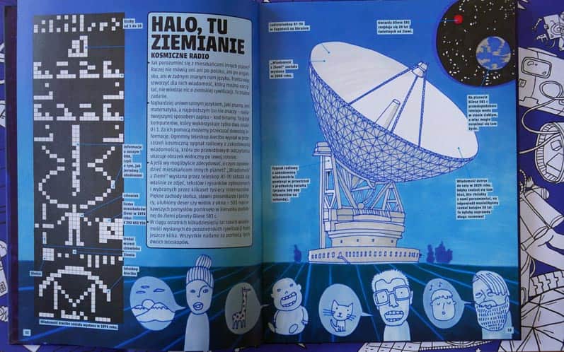 "Tu jesteśmy" to bardzo bogato ilustrowany przewodnik po współczesnym wszechświecie. W parze z pełną kolorów, komiksową grafiką dostaniemy też całkiem sporą garść faktów zamkniętych w ponad 40 współczesnych kosmo-tematach.
