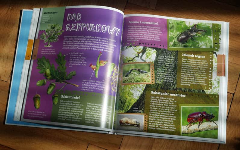 „DRZEWA NASZYCH LASÓW” z serii „Poznaję i rysuję” to kolejne spotkanie z tymi samymi 14 gatunkami drzew. Tym razem dokładnym, dużym rysunkom towarzyszy po jednej ciekawostce: „nocie botanicznej”, bo też nie tyle o czytanie, a o tworzenie kolekcji tym razem chodzi. Lepiej zapamiętamy to, co nie tylko widzimy, ale i sami narysujemy – stąd strony poprzeplatane są przeźroczystymi kalkami, na których należy odrysowywać kontury liści, kwiatów i owoców drzew. Główne zadanie czytelników to jednak zgromadzenie jak największej ilości przedstawionych elementów (np. w osobnym zeszycie i pudełku), wtedy zasłużą na tytuł „dendrologa doskonałego”.