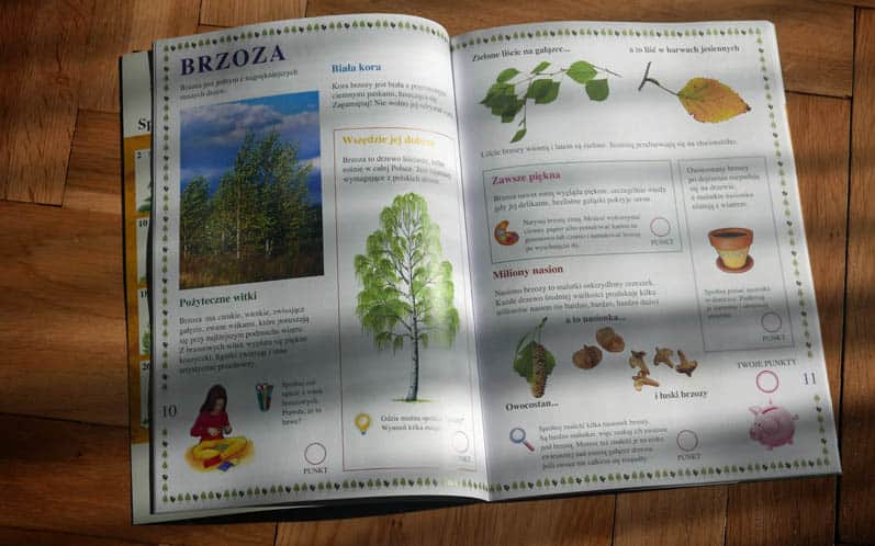 Autorzy zeszytu Młodego Obserwatora Przyrody „DRZEWA LEŚNE” poza ciekawostkami o 14 gatunkach drzew przygotowali dla czytelników całą masę zadań i zagadek: czasami trzeba rozwiązać rebus lub krzyżówkę, czasami odnaleźć coś w terenie, wkleić, dotknąć, powąchać, lub z pomocą rodziców odszukać dodatkową informację. Na najwytrwalszych czeka dyplom, chociaż przecież najlepszą i najtrwalszą nagrodą będą doświadczenia i wiedza, które po tak aktywnej zabawie na pewno zostaną na długo w głowie małego przyrodnika!