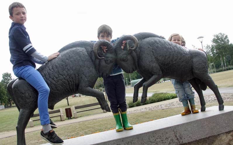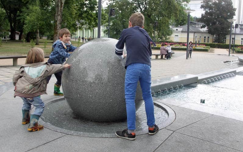 Sami wprawdzie nie skorzystaliśmy, za to pobawiliśmy się z baranami, pospacerowali po alejkach. Do parku dochodzi deptak, który zaprowadzi nas do zabytkowego Domu Zdrojowego, przy którym dzieciakom najbardziej spodobała się fontanna w postaci wielkiej, ruchomej (!) kamiennej kuli.