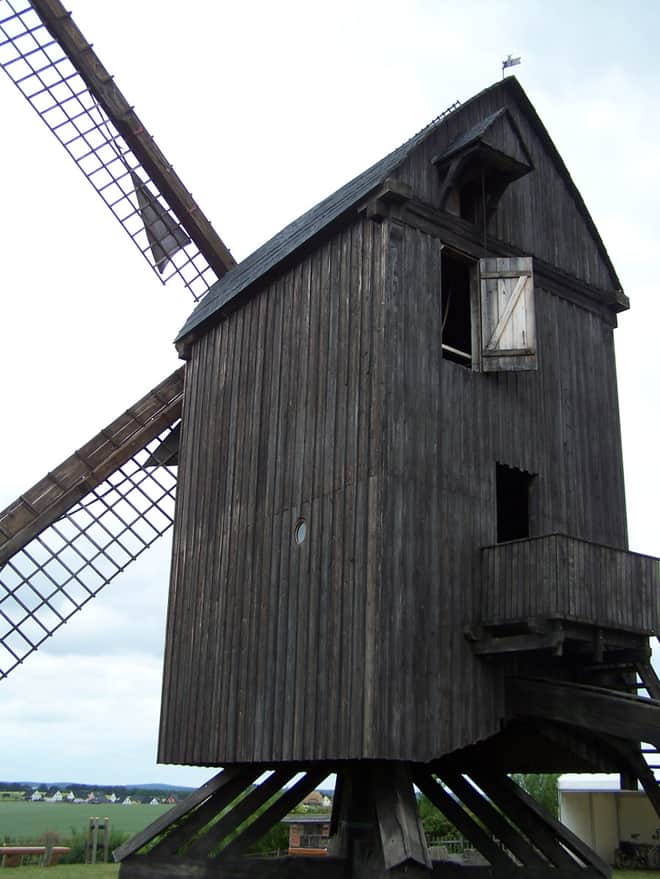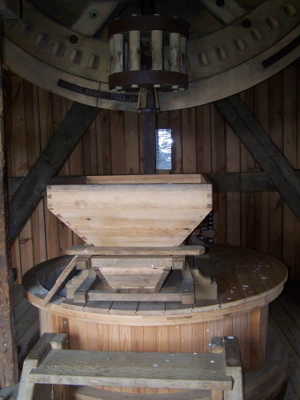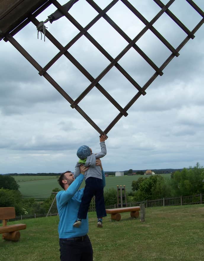 W wiatraku są wąskie drewniane schodki, należy poruszać się ostrożnie zwłaszcza z maluchem w nosidełku. Wózek lepiej zostawić w aucie.
